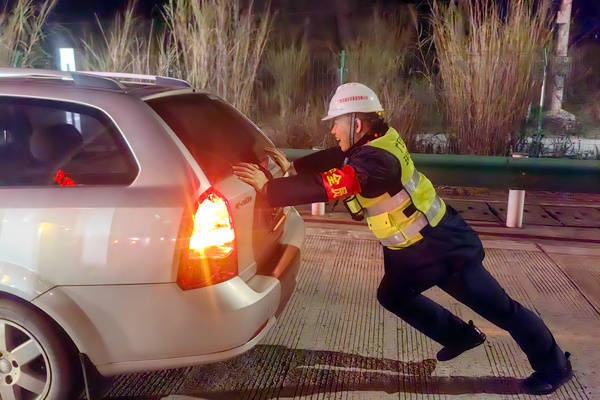 推车排障助启程。2月21日19时,一辆一类客车在福绵机场收费站出口1车道突发故障。因水箱缺水导致水温过高,车辆无法启动,滞留在车道地磅前,司机徐先生焦急万分。当班收费员廖远桦第一时间发现异常,立即上报值班管理人员陈永杰。两人迅速赶到现场,分工协作,一边在车辆后方做好安全防护,引导后方车辆有序通行,一边合力将故障车推至外广场安全区域。整个过程仅用时6分钟,车道迅速恢复畅通。将车辆停稳后,两人还主动为车辆水箱加满水,帮助排除故障。当车辆重新启动时,徐先生感动不已:“没想到收费站的服务这么周到,真是太感谢你们了!”(唐红艳、陈思宇、杨秀琴)